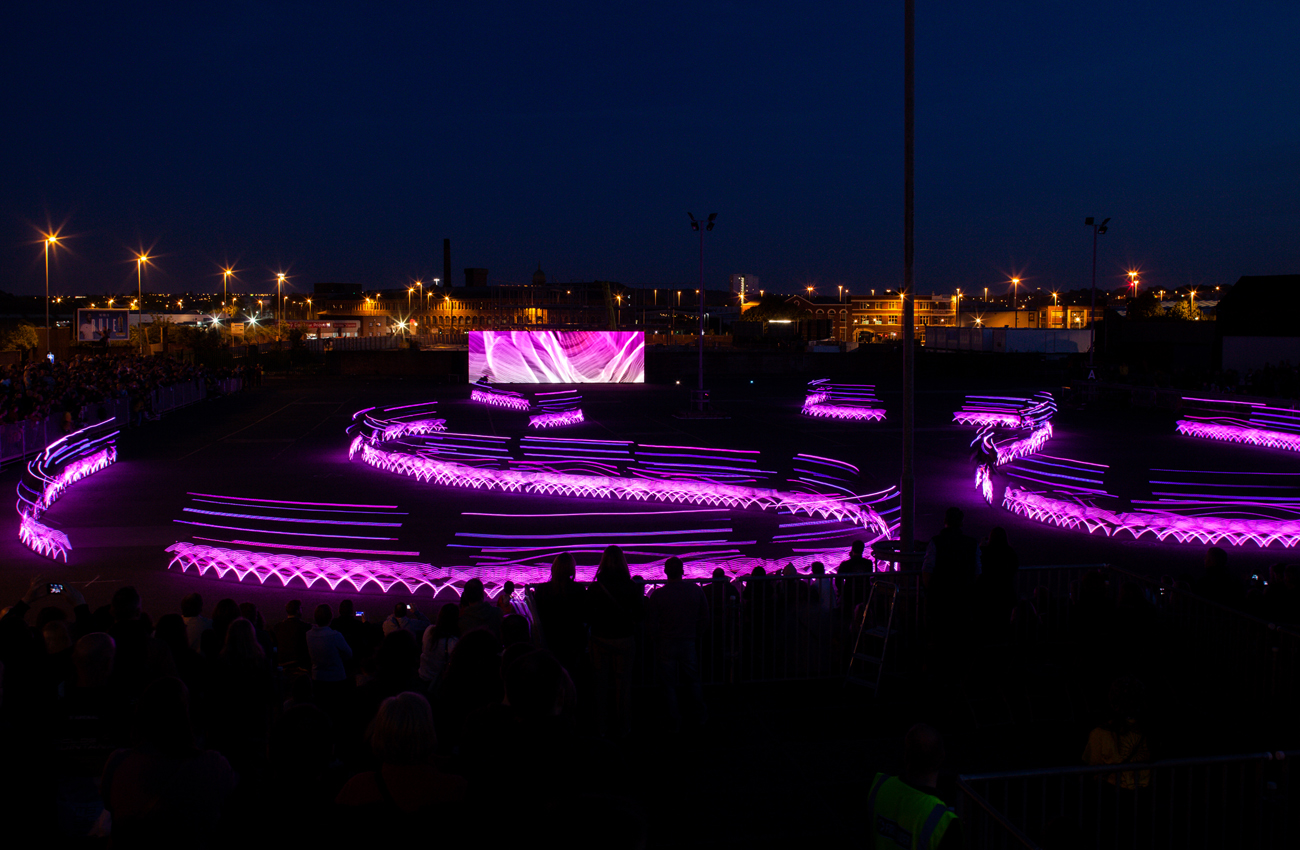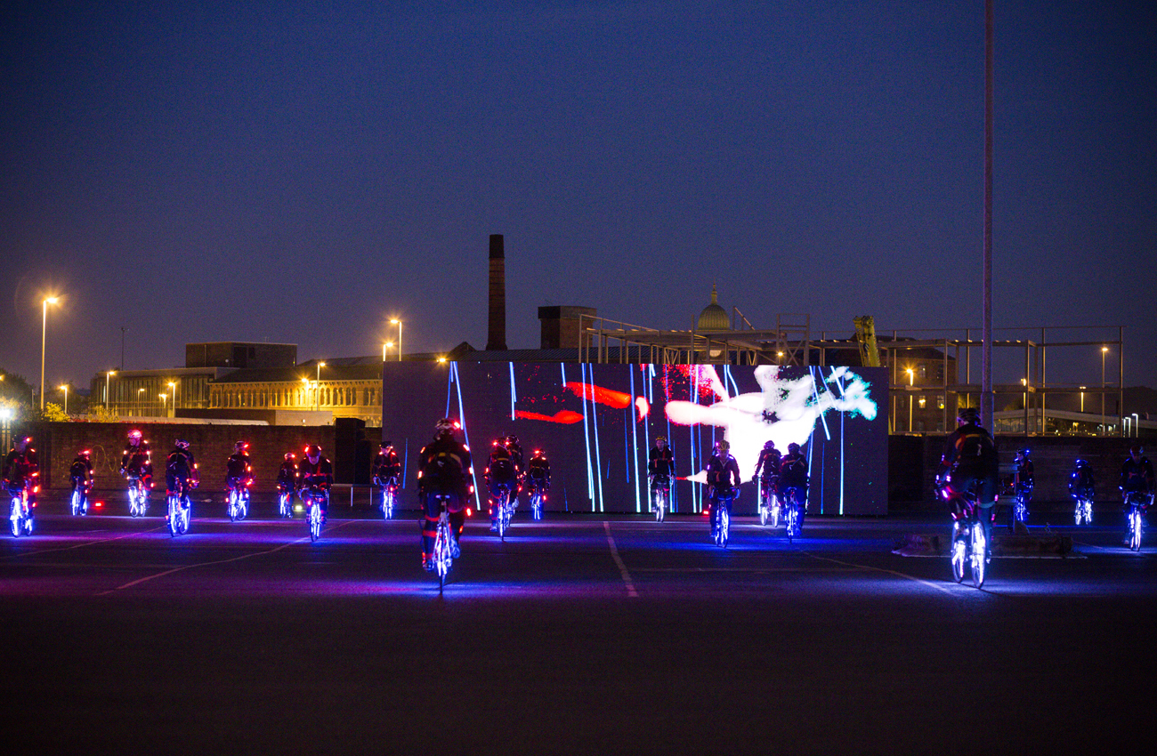 Inspired by the wheel in motion, the work fused performance cycling with athletic choreography performed by Phoenix’s dancers. The landscape of Yorkshire became an open canvas carrying a new visual language of light in motion, as Ghost Peloton took the work into a new creative territory, using cycling as the core of mass communal movement.